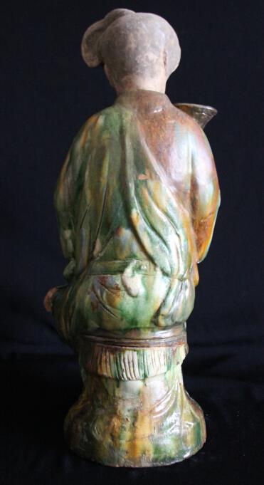 作品人物面部丰满。身著窄袖长衣、袒胸。怀中所抱鸭子肥壮、羽毛丰满。女俑和鸭子身体中空,连为一体,似为插花器。女俑服饰及鸭子施色彩斑斓的三彩釉。女俑造型生动形象,栩栩如生,给人以呼之欲动之感。