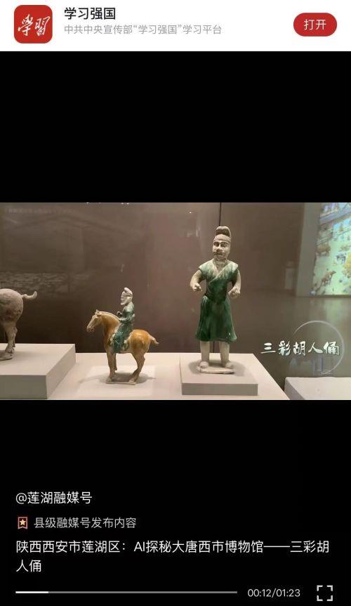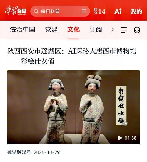 近日,《AI探秘大唐西市博物馆》第二期5篇系列短视频在“学习强国”莲湖区平台正式上线,其中3篇经“学习强国”陕西学习平台、1篇经“学习强国”中央宣传部总平台转发及推荐,备受关注。这是该系列作品再度获得这一国家级平台的认可。该系列短视频目前已推出9篇,以人工智能视角解读大唐西市博物馆丝路文化与盛唐商业文化,以科技赋能文化传播,让千年西市焕发数字时代的新活力。