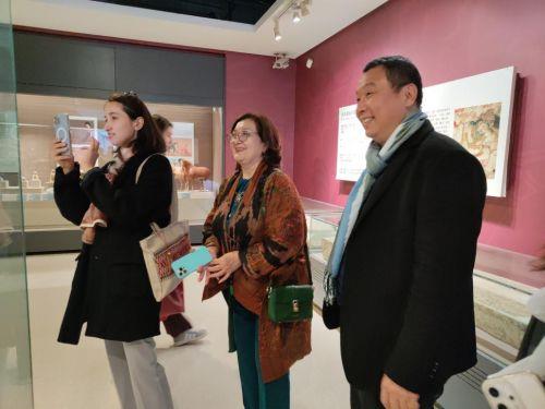 随后,乌兹别克斯坦专家参观大唐西市博物馆。丝绸之路国际研究院院长Prof.Mavluda Yusupova对西市遗址、丝绸纹样、骆驼商队、胡姬酒肆等再现的历史场景等表现出浓厚的兴趣。并就丝路贸易、西市业态及布局、文物材料与年代等具体问题与馆方人员进行交流。通过实地参观,嘉宾们对唐代丝绸之路的历史盛况与中国在文化遗产保护领域所做的工作有了更为直观和深刻的认识。