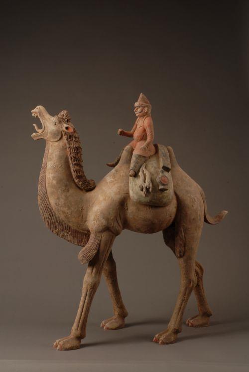 胡俑头戴尖头毡帽,浓眉,深目高鼻,八字胡须,身穿红色翻领胡服,黑色长裤,足蹬尖头靴,双手作持缰控驼状,双腿紧夹坐于驮囊之上,上饰兽头,两侧挂物。双峰驼抬头远望,张嘴露齿,鬃鬣飘动,阔步前行。此俑形体高大,工艺细致,是唐代彩绘胡人骑驼俑系列中不可多得的精品。