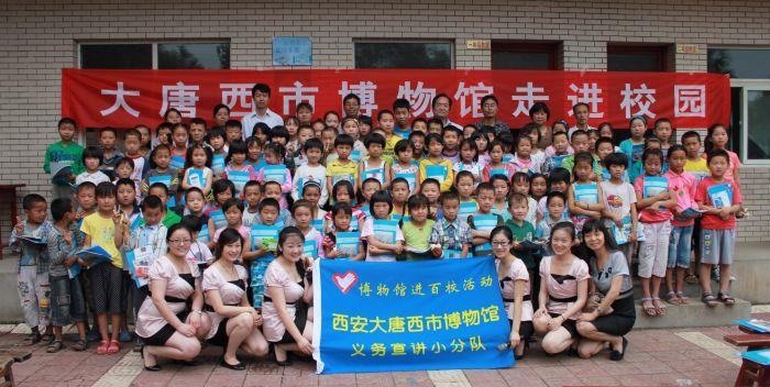 为进一步发挥民办博物馆的社会教育功能,关注未成年人成长,2012年7月3日上午,大唐西市博物馆宣讲小分队走进秦岭山下的东村小学,为100多名小学生进行了义务宣讲献爱心活动。这次活动受到了东村小学老师和同学们的热烈欢迎。
